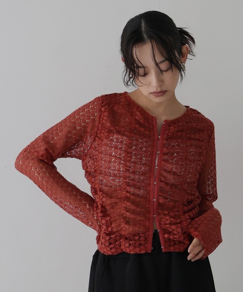 胸元のシャーリングがトレンド感のある透かし編みカーデ