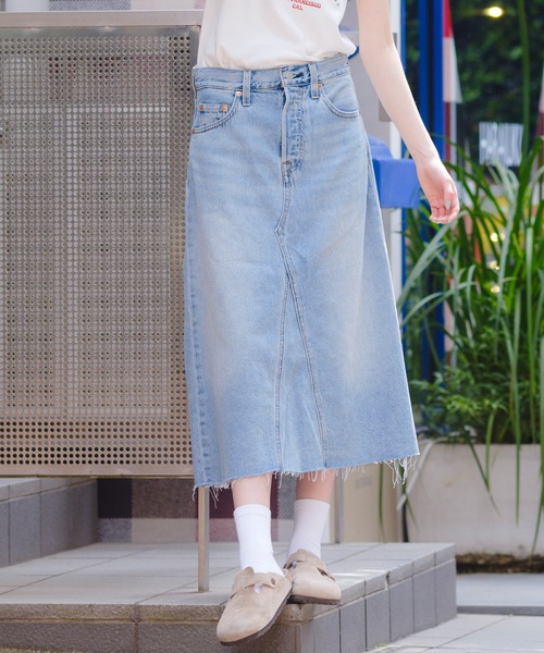 Aラインのデニムスカート。ハイライズ、ひざ下の丈感、再構築デザインが特徴です。春先に合わせやすいライトインディゴカラー足元はヒールなどの大人な合わせ方は勿論、スニーカーなどとカジュアルな合わせ方もお勧めの一本です。