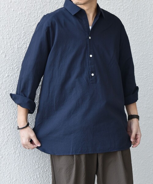 着回し力抜群の夏シャツ!コットンリネン素材を使用したプルオーバーシャツ【素材特性】柔らかな生地感のコットンと肌離れが良いリネン混紡した素材。