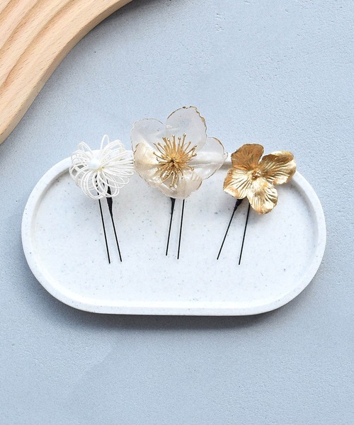 【髪飾り Uピン3本セット アメリカンフラワー ブロッサム・ゴールド・水引】