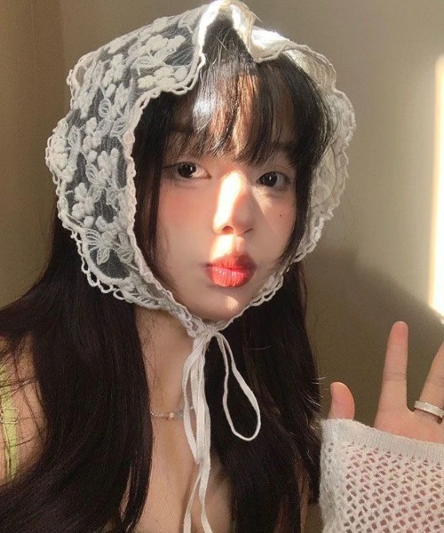 繊細なフラワーレースが顔まわりを華やかに見せてくれて、スタイリングのアクセントにぴったり。