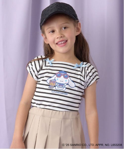 マリンスタイルに変身したシナモロールとぬいぐるみのくまさんのプリントがかわいいTシャツは、フレンチスリーブにポイントのリボンがついてよりマリンの雰囲気に♪