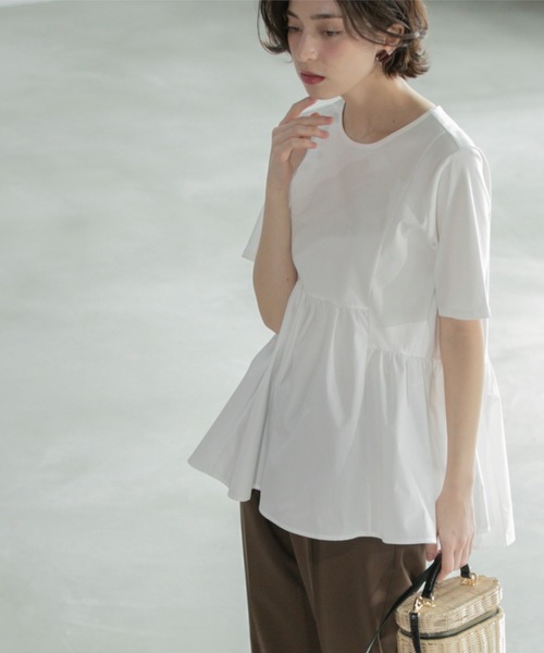 ・身頃はカットソー素材、裾はシャツ素材で切り替え、Aラインシルエットに仕上げた華やかなペプラムデザイン。