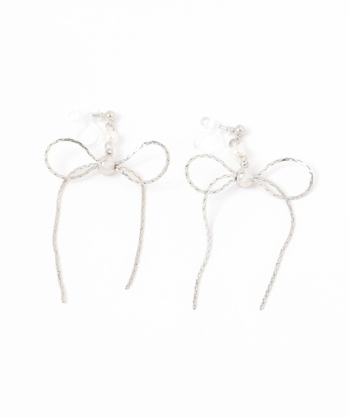 耳元でさりげなく揺れるリボンモチーフが、可愛らしいアイテムです。