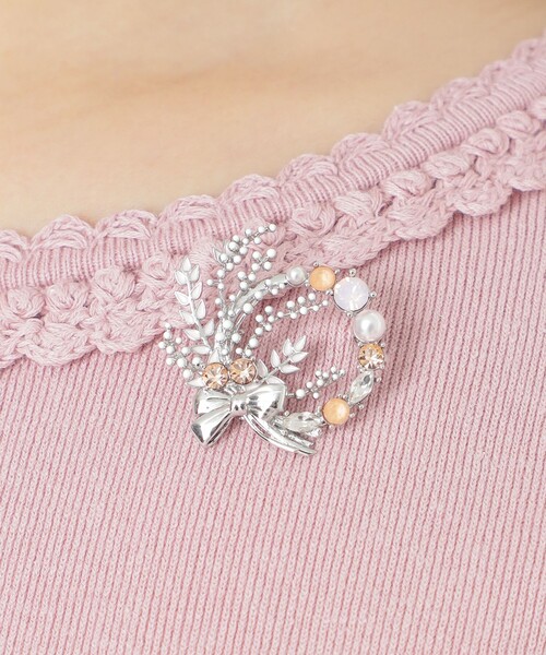 サイドから中心にかけてミモザに模したフラワーブーケを配置して、リボンやビジューで華やかに彩ったブローチ。身に付けるだけでコーディネートを華やかにしてくれます。