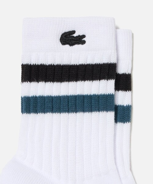 バイカラーの2ラインがスポーティなフィーリングを放つアメリカンリブソックス。カラフルなワニロゴ刺繍も目を引くアクセントに。コットン×ポリエステルのブレンドニット素材が適度なフィット感に仕上げ、足底のパイル地切り替えがクッション性をプラス。一日中快適な履き心地を叶えてくれるアイテムです。