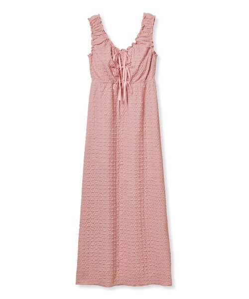 肩にギャザーを入れたカップイン仕様のワンピースは、縦に3本連ねたリボンの表情が華やか。