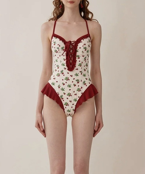 可愛らしいストロベリープリントが特徴のヴィンテージ風ワンピース水着。シンプルでありながらもキュートさ満点のデザインで、海辺やプールでのリラックスタイムにぴったりです。