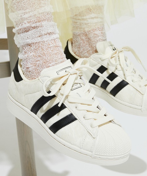 【アディダス公式ショップ】アディダスが誇るスーパースターのポニーヘアバージョン。今のモードに合わせてアップデートされた、このアディダス スーパースター IIを、今年のワードローブの一軍に。90年代の伝説的なバッシュを彷彿とさせる、滑らかなレザーとポニーヘアの組合せが新鮮な一足。特徴的なシェルトゥはその特徴は守りつつ、より滑らかな丸いシェイプにマイナーチェンジし、バッシュとして一世を風靡したスタイルを留めたラバーカップソールを合わせている。遅めのブランチやナイトアウトにもぴったりの、反骨精神を纏ったこのスニーカーが、どこに行っても存在感を発揮する。 ※「Super Star」は、株式会社ムーンスターの日本における登録商標です。