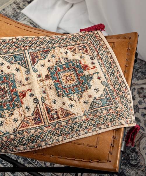 オリエンタルなラグデザインを施したアンティーク調の風合いが魅力四隅に施されたタッセルがさりげなくおしゃれなポイントに!