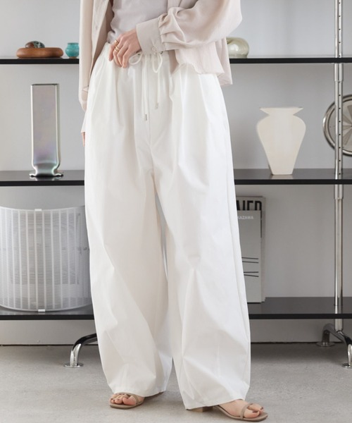 スポーティーな雰囲気溢れるナイロン風素材のワイドパンツ。