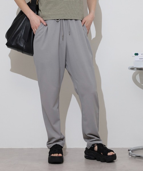 清涼感のある肌触りの良い梨地素材を使用し、伸びやすく履きやすいテーパードパンツ。