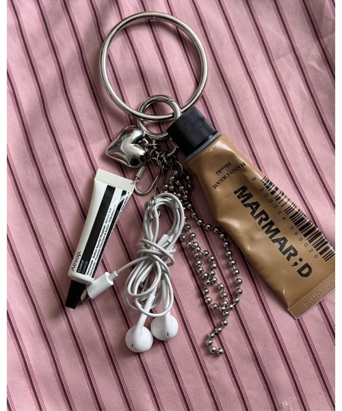 長めなボールチェーンとビッグフープが特徴のバッグチャーム。