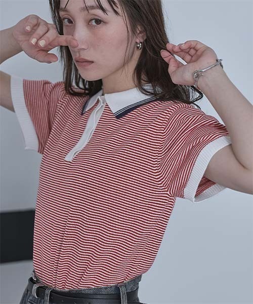 大人っぽい印象を与える細めのボーダーデザインのポロニットトップス。