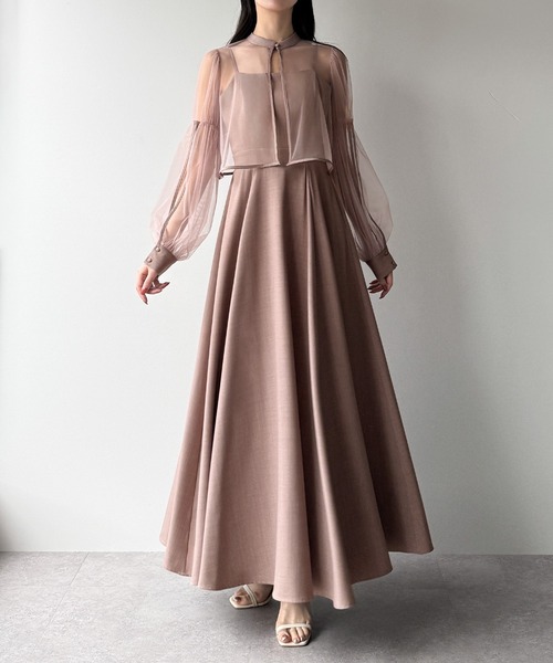 ワンピース スリットスリーブチュールボレロ+フレアキャミワンピースset「高身長サイズMT/低身長サイズS有り」