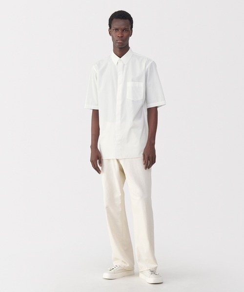 ややゆったりとしたシルエットの半袖シャツです。フロントは比翼仕立てのボタン開きで、シンプルでミニマルなデザインです。