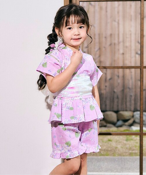 アジサイに雨のしずくが入っているようなデザイン。また、ラメがプリントされているので華やかな印象に。可愛らしいイメージのお子様にぴったりです。
