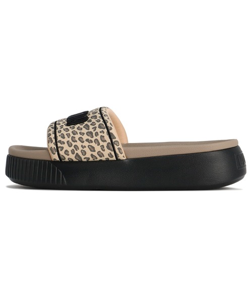 アッパー中央にPUMAのワーディングロゴ、軽量のEVA素材で構成された厚底ソール。PUMAの代名詞的なデザインアプローチであるレオパード柄をアッパー全面にプリント。足元からアクティブなセンスを光らせてくれます。クッション性が高く、長時間のご使用でも疲れにくいのが魅力の1足です。