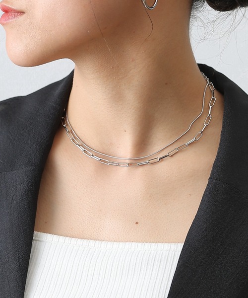 華奢なチェーンネックレスだけでシンプルに着けたり、