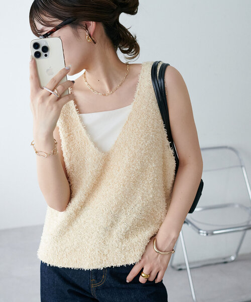 ・肌あたりもやわらかく、もこもことした質感が特徴です●スタイリング・インナーにキャミソールやタンクトップを合わせて、夏らしい軽やかなレイヤードスタイルに。