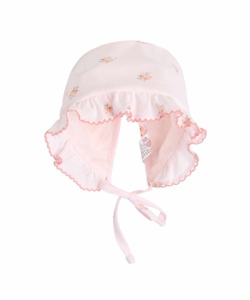 柔らかく肌が敏感な赤ちゃんに適したモダール混生地ののボンネット帽子。人気のピンクカラーに小花柄のデザインでフリル部分の刺繍パイピングがよりおしゃれ。ベビーギフトとしてもおすすめ。