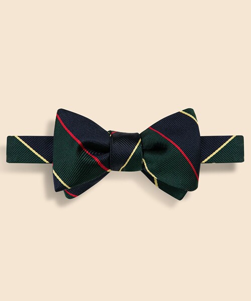 ブルックス ブラザーズを象徴するアメリカ製レップボウタイニューヨーク市に所在する最後のネクタイ工場である、MONGRU(モングル)社に縫製を依頼したアメリカ製のレップボウタイです。レップタイ用の生地を長年委託していた英国バーナーズ社のレシピを再現し、世界的な絹織物の産地である京都・京丹後市にて生産したシルク生地を使用。60年以上稼働しているシャトル織機を使用し、経糸に6plyという通常より細い糸を高密度に打ち込んで織り上げられた生地は、堅牢で、発色が良く、レップ織りの畝の際立つ、ふっくらとした質感が特徴です。