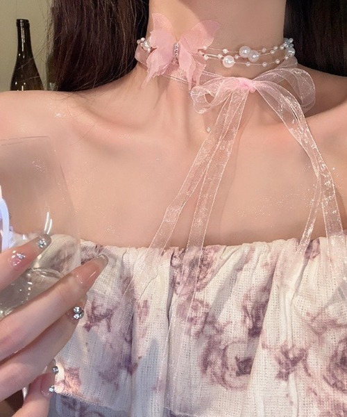 ふわりと軽やかなシアー素材のリボンに、可憐な蝶と上品なパールをあしらった、とっておきのチョーカーが登場。