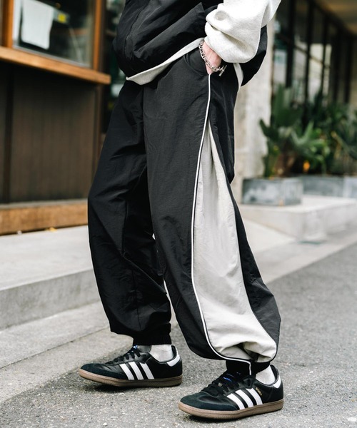 サイドのパイピングがアクセント、裾はゴム仕様のジョガースタイル。