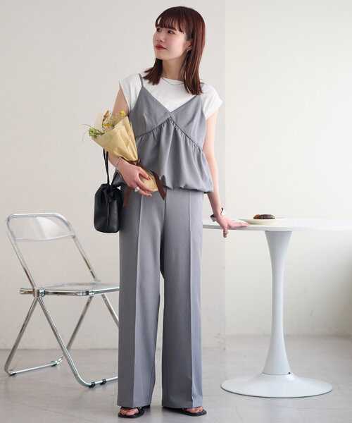 リラックス感と女性らしさを兼ね備えた、キャミサロペット。●デザイン胸下に施された切替のギャザーデザインが、ふんわりとした立体感を演出。