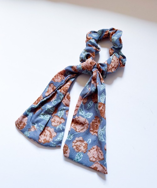 華やかなフラワープリントとリボンスカーフが一体になったシュシュ。