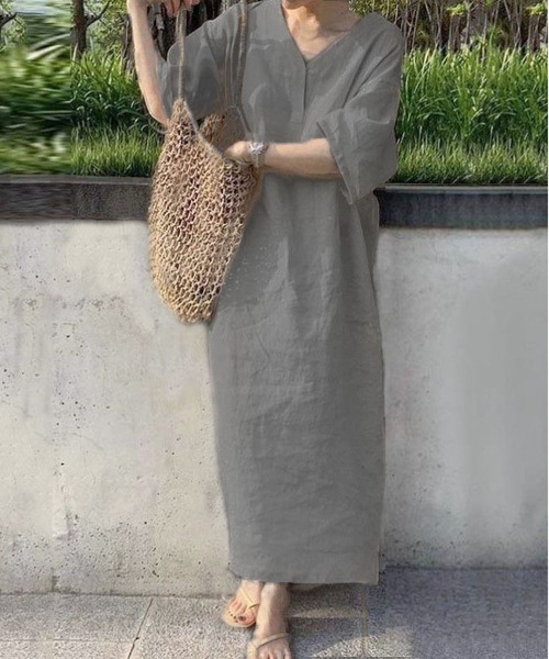 シンプルなデザインながらも存在感のあるワンピースは、ナチュラルな雰囲気からきれいめなコーデまで幅広く対応。フラットサンダルやスニーカーでカジュアルダウンも良し、ヒールやアクセサリーを合わせて大人レディに仕上げても素敵です。一枚持っておくと、季節を問わず多彩なシーンで活躍してくれます。