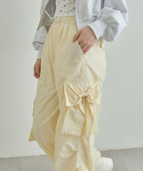 ・両サイドのポケットには大きなリボンがデザインされていて、女の子らしさを演出するデザイン。