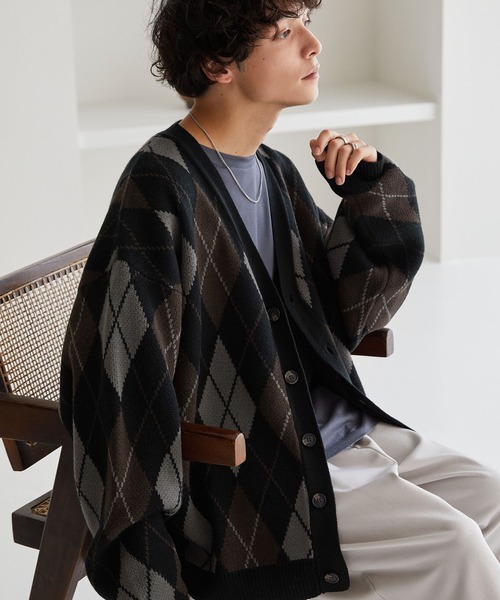 参考商品名:ボリュームWジャガードニットアーガイル柄ルーズカーディガン