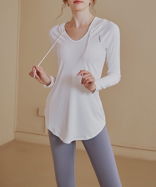 細身のシルエットが女性らしいスポーティーなフード付きトップス