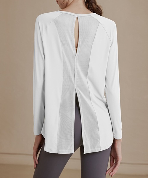 メッシュ素材を組み合わせて通気性を良くし、ラグラン切り替え部分に用いることで肩まわりがスッキリ見え。