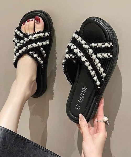 フリンジを施したツイードライクな生地にパールをあしらったサンダル。