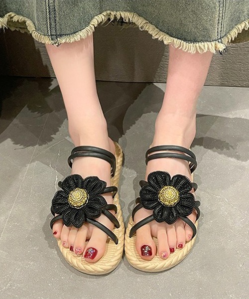 大きなフラワーモチーフが大人可愛いフラットサンダル。