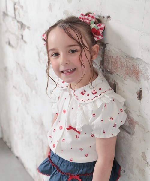 フリルレースにリボン、襟にあしらったチェリーレース柄の刺繍がとってもガーリーなうさみみ半袖ブラウス。サラッとしたコットン素材のメッシュ天竺を採用しており、柔らかく涼しい着心地が魅力です。チェリープリントがキュートなレッドと、女の子らしい甘さが可愛いピンクの2色展開なのでコーデに合わせて様々な雰囲気を楽しめるアイテムです♪