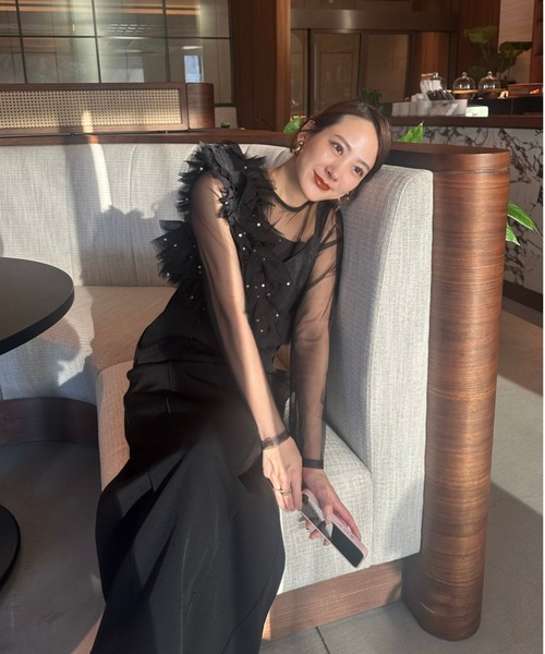 ・ランダムに散りばめたパールが目を惹くチュール生地を採用。