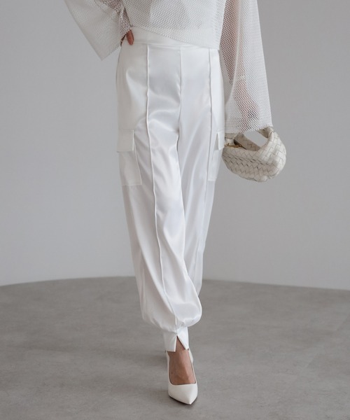 艶感のあるサテン素材が女性らしさを引き立てるカーゴパンツ。