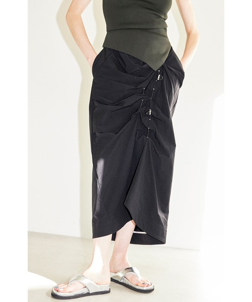 スポーティーな素材感と、相反する女性らしいドレープシルエットがユニークな一着。