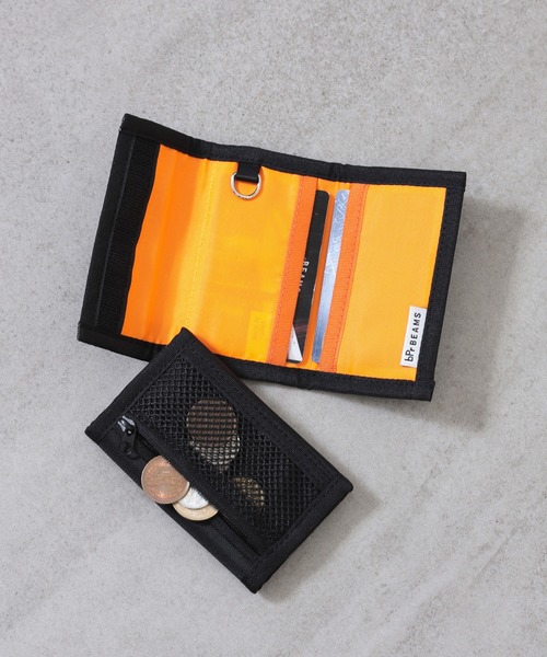 お札は三つ折りにすれば収納でき、外側にはコインが入れられるメッシュポケットを装備。カラビナやキーホルダーを付けられるよう、Dカンを搭載しています。