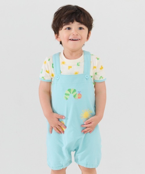 大人気絵本「はらぺこあおむし」とmoimolnが初コラボ。春らしいサックスブルーのオーバーオールと、はらぺこあおむしに登場するキャラクター達がモノグラム柄となってちりばめられた総柄トップスとのコンビネーションセットアップ。オーバーオールの胸元には、はらぺこあおむしに登場するキャラクター達を大胆にプリントしました。
