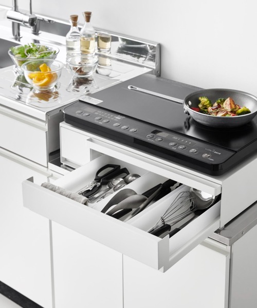 引き出せるスライドテーブルはお皿や調理小物の一時置きなどに、大きい引き出しは調理小物などの収納に、小さい引き出しには調味料などの収納におすすめです。