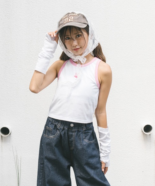リップロゴと襟元の配色パイピングがアクセントのタンクトップとアームカバーの2点セット。