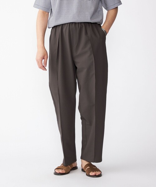 ”COOLMAX(R)”を使用した盛夏に穿きたい大人のリラックスイージーパンツ【素材特性】通気性に優れた”COOLMAX(R)”糸を使用した、凹凸感のある肌離れの良いシアサッカー素材を使用。
