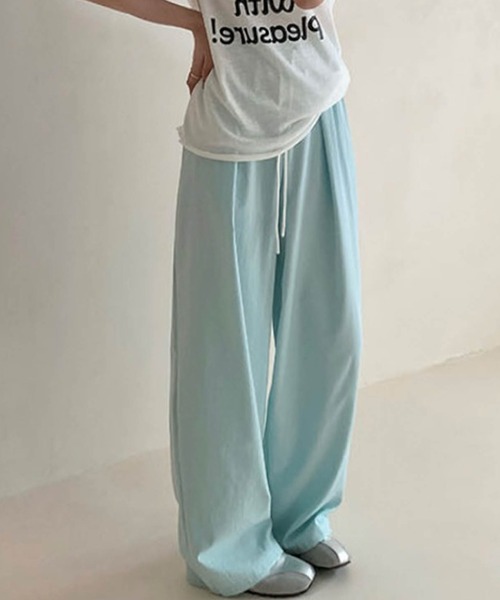 リラクシーな着心地が魅力のドローストリングワイドパンツ。ウエストは調整可能な紐デザインで、着脱しやすく、お腹まわりもストレスフリー。