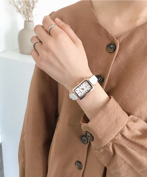 端正なスクエアフェイスが、装いに静かな品格を添えるレディース腕時計。