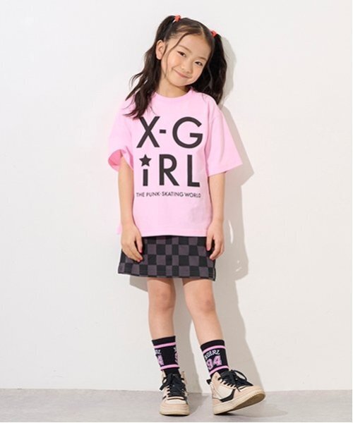 ビッグシルエットのロゴTシャツとチェック柄スカートを組み合わせたセットアップです。
