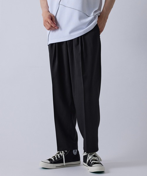 ボックスプリーツのワイドテーパードパンツ。